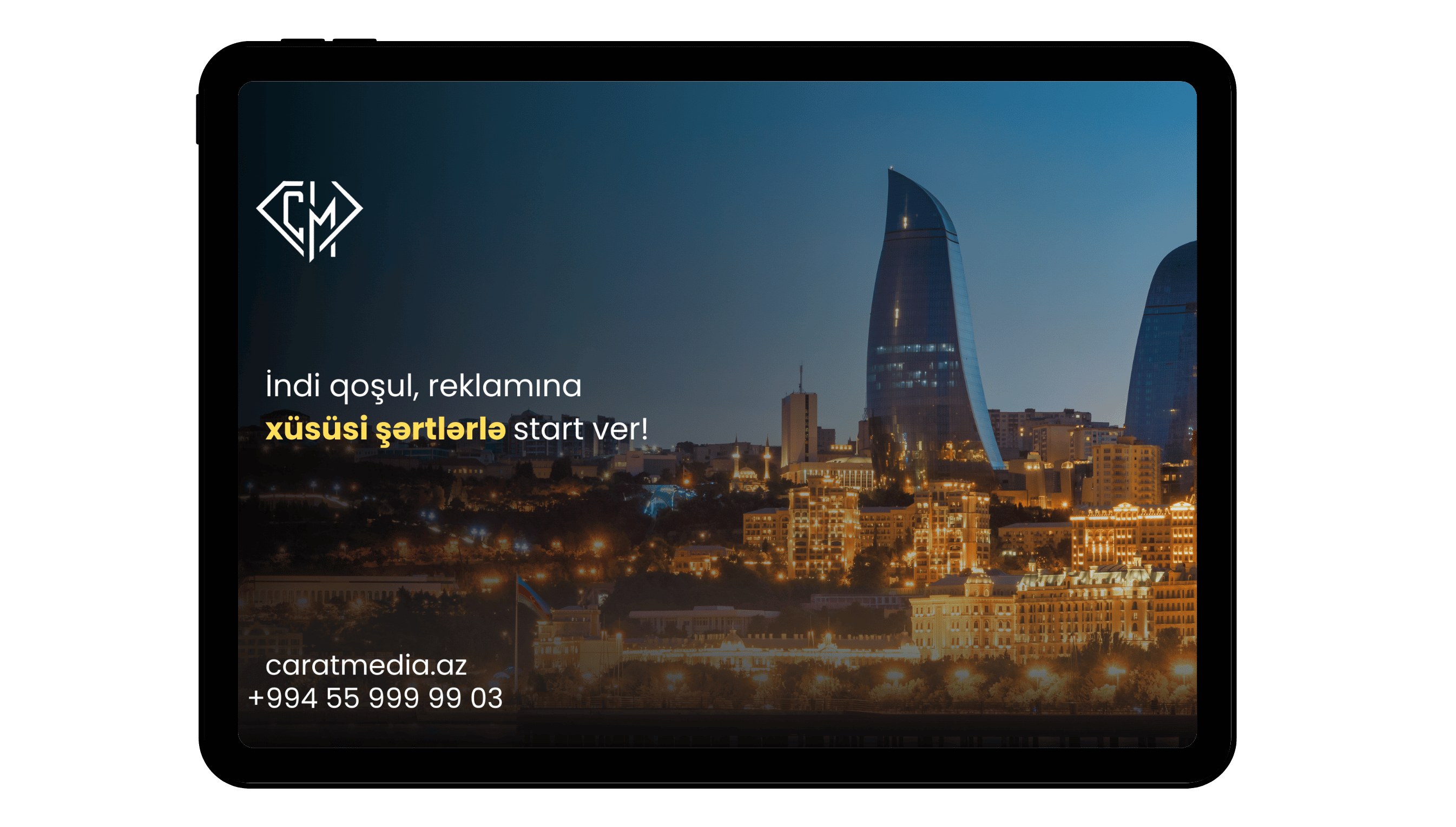 Marketinq, texnologiya və şəhər həyatının dinamikasına əsaslanan media şirkətidir. Biz taksilər üzərindən, o cümlədən komfort və premium sinif avtomobillərdə yerləşdirilən monitorlar vasitəsilə brendlərə müasir və effektiv reklam imkanları yaradırıq. Eyni zamanda Carat Media sosial şəbəkələrin peşəkar idarə olunması, reklam materiallarının hazırlanması, çapı və montajı üzrə kompleks xidmətlər təqdim edir. Fəaliyyətimiz keyfiyyət, etibarlılıq və operativlik prinsipləri əsasında qurulub.